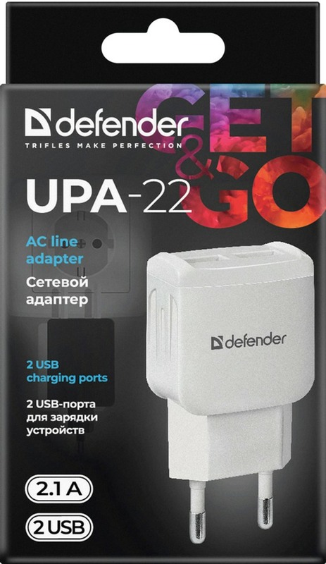 Defender UPA-22 — мережевий зарядний пристрій з двома портами USB Type-A. Він допоможе швидко та безпечно зарядити будь-який смартфон, планшет, навушники за короткий проміжок часу. Виготовлений з вогнетривкого пластику, який стійкий до високих температур і зовнішніх пошкоджень. Завдяки компактному дизайну його можна брати з собою у відрядження, подорожі або на роботу і не турбуватись про зарядку необхідної у повсякденному житті техніки. Всередині зарядного пристрою передбачено захист від стрибків електрики, перегріву та інших неприємностей, що робить його використання безпечним.