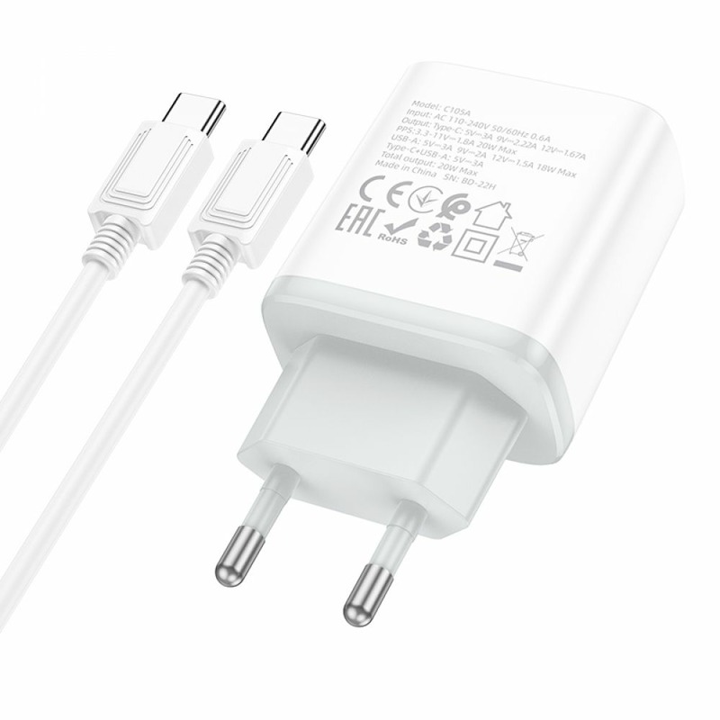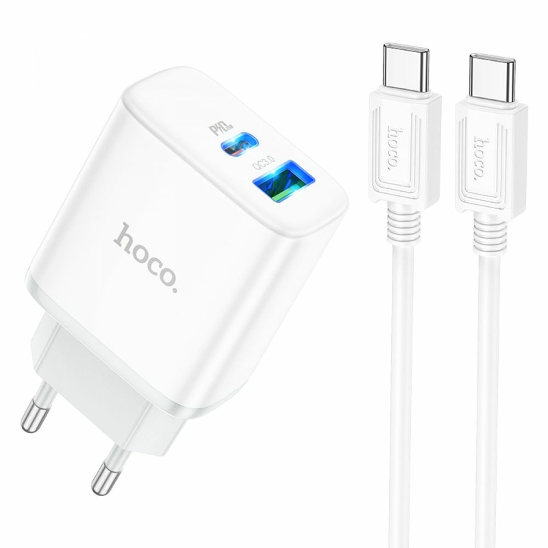 Hoco C105A Stage dual port PD20W+QC3.0 + Type-C to Type-C Cable White