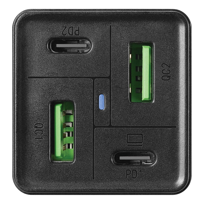 Sandberg 4in1 Charger — зручний зарядний пристрій, який здатен заряджати як ноутбук, так і мобільне обладнання. Завдяки 2 портам USB Type-C і 2 портам USB Type-A ви можете легко заряджати до 4 пристроїв одночасно, уникаючи безладу з кабелями. Підтримує протоколи швидкої зарядки Power Delivery і Quick Charge 3.0, а також технологію GaN, щоб забезпечити швидку та безпечну зарядку, яка не призведе до перегріву або надмірної зарядки. Аксесуар виконаний у чорному кольорі, який легко поєднується з іншою технікою. Виріб має зручну конструкцію, невеликі розміри та вагу. Крім того, вирізняється широкою сумісністю та багаторівневим захистом. Вихідна потужність моделі — 65 Вт.